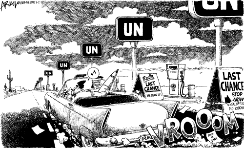 The UN should choose a date. France, Germany, the UK, Russia, the US, *everyone* should come up with a date. No ifs ands or buts. I just don't see that as happening. Until it does, the stance of countries urging "more time" is severely weakened. Because without an end-game scenerio, calls for "more time" are equivalent to "let's do nothing." Again, I'm not sure who is right in this whole situation. I just think that if Germany, France, et. al. truly are asking for more time they need to put their money where their mouths are. If they truly believe we should never invade Iraq, they should say that too. Whether or not you agree with the Bush stance (I'm not sure myself), at least it has the clarity required to move the situation forward.