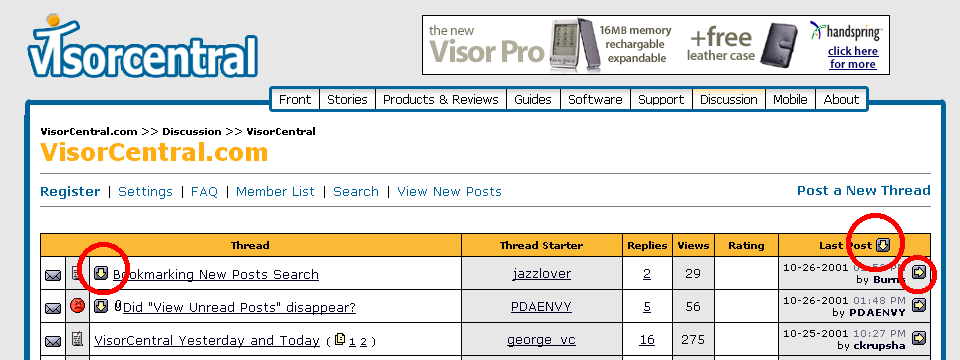 On threads that have new posts, there are 2 arrows. one is right before the thread title, on the lefthand side, and it points downward. This takes you to the first post that was posted since you last looked at the thread.